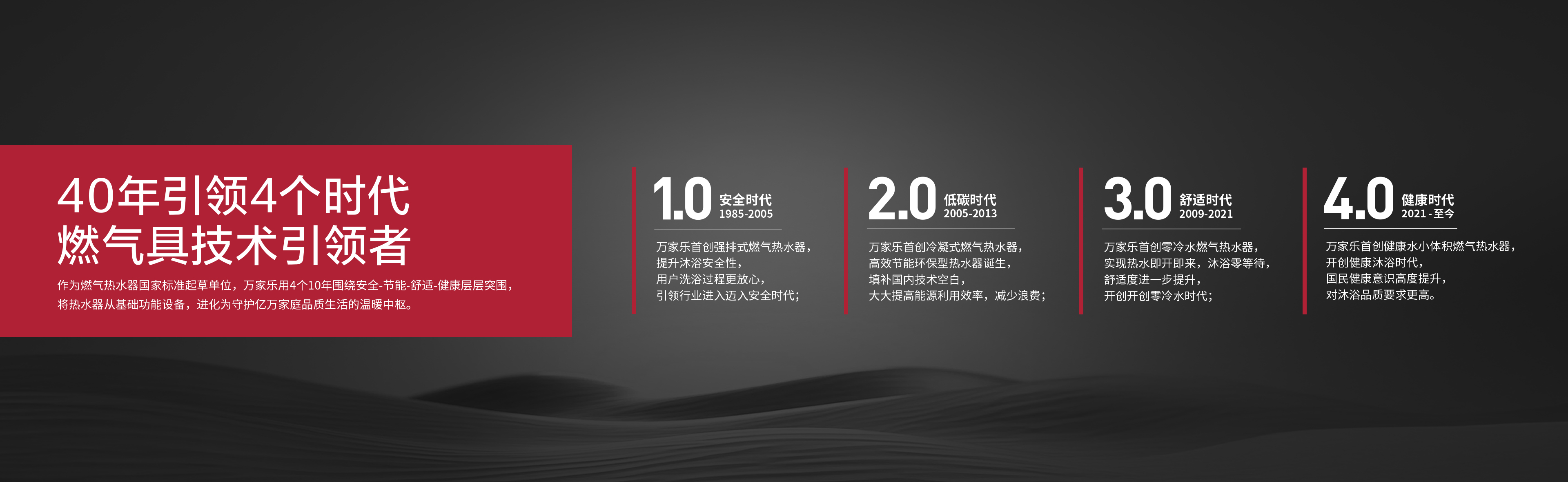 萬家樂始于1985年,專注于改善中國家庭熱水和廚房生活,產品覆蓋熱水、廚電、凈水、采暖四大品類,致力為用戶打造品質、快樂、美好的生活。